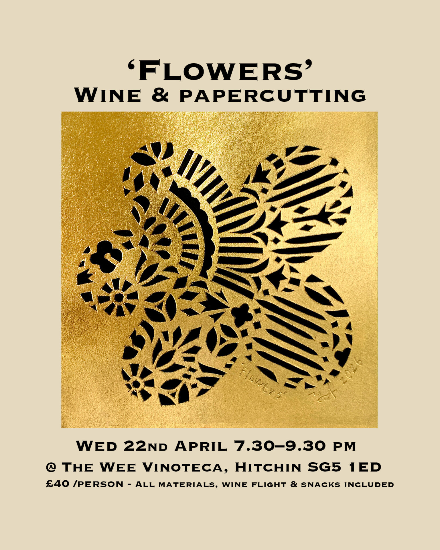 Led by a local artist and wine lover Yoshie, you’ll learn the delicate art of paper cutting using exquisite Japanese hand-pressed paper and gold brass leaf. No experience necessary — just bring your curiosity and a steady (ish) hand.