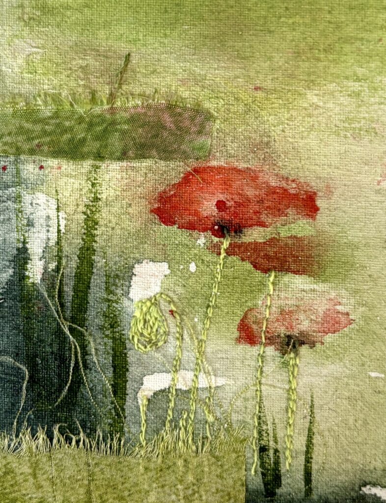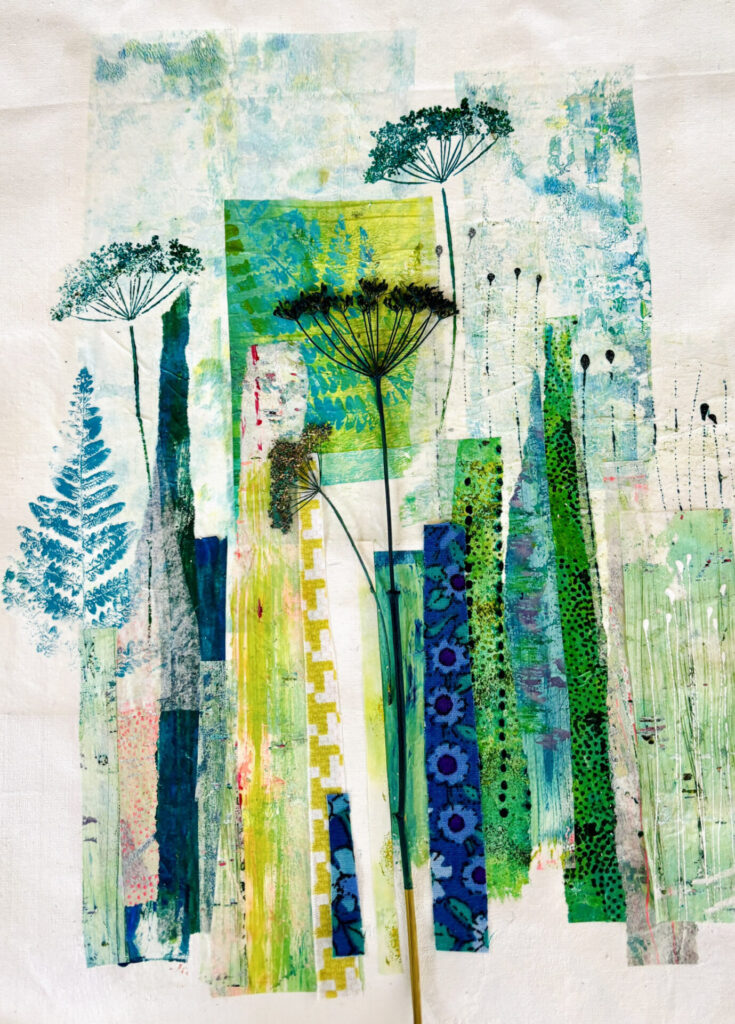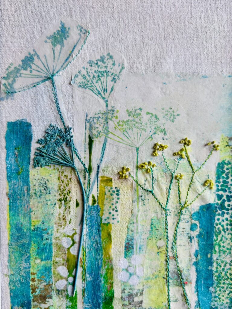 This means that my own artwork takes many forms , beginning with a painted background , I add layers of collage and printed paper, fabrics and a line of stitch finishes the work.