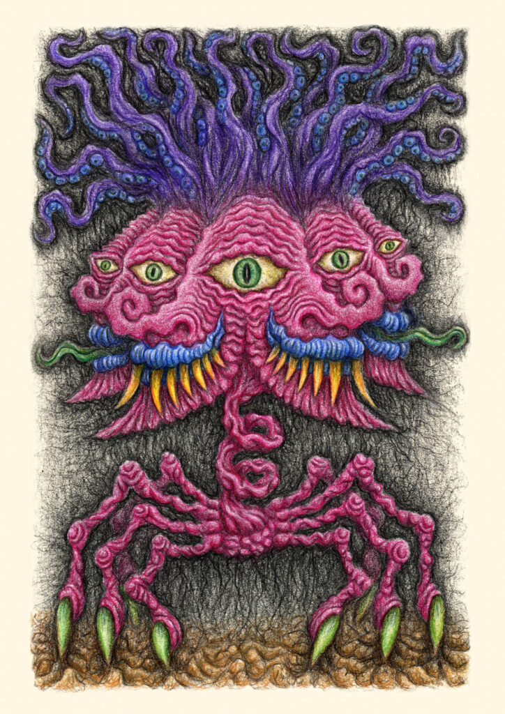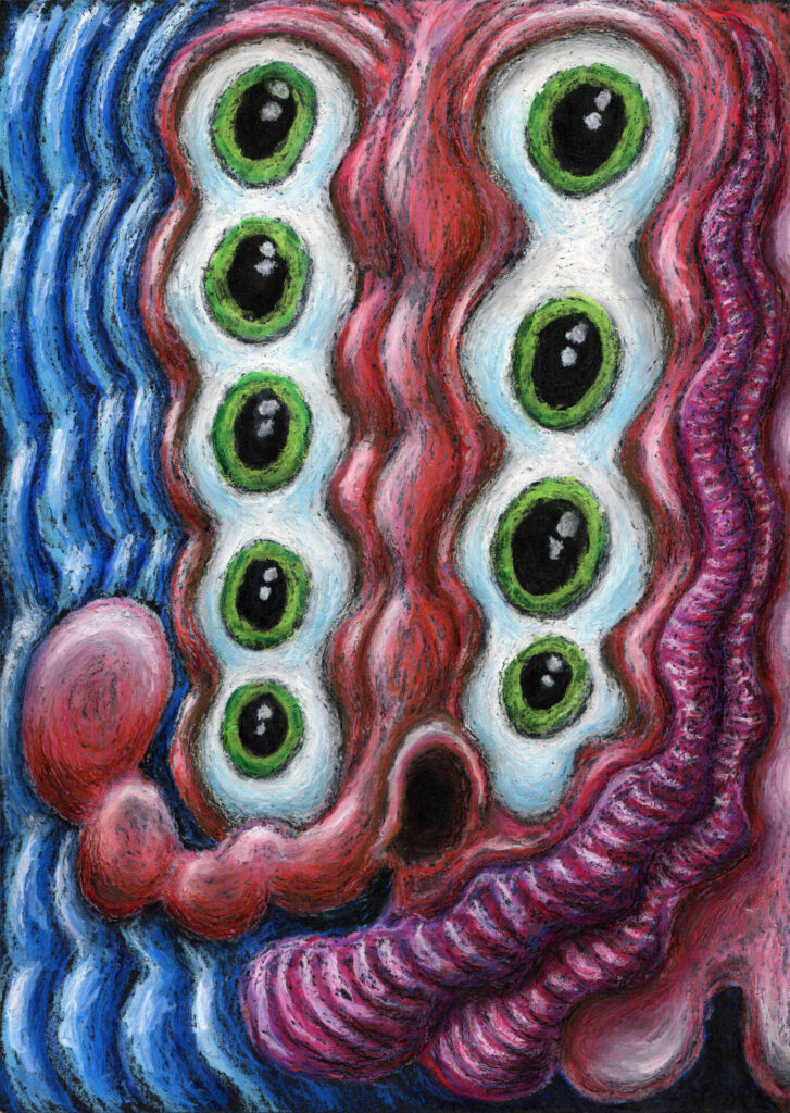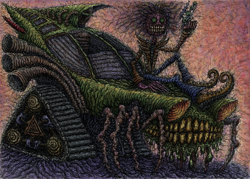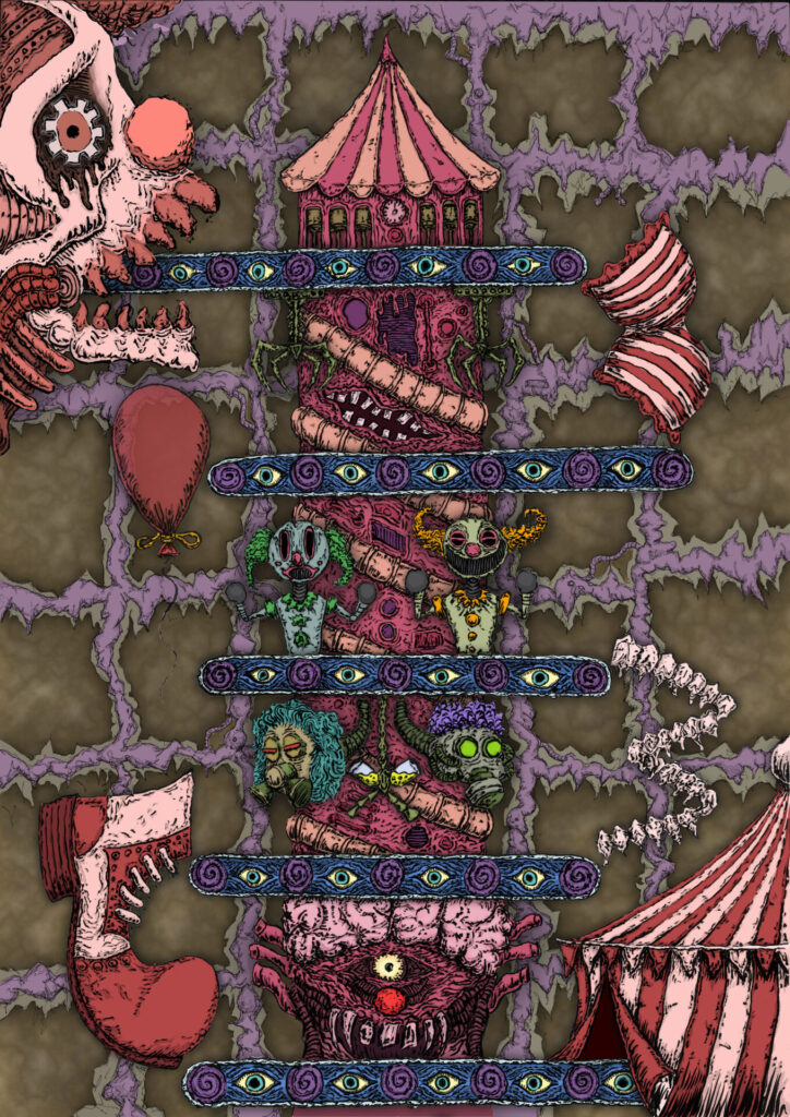 My work primarily focuses on characters, narratives and world building, exploring themes in surrealism, humour, horror, science fiction, technology and human habits. Conjuring up quirky and playful projects working within illustration, comics, frame animation, motion design, t-shirts, music artwork, sound design and electronics. I’m multidisciplinary and I enjoy exploring different mediums, since the lockdown era I have mainly balanced digital with traditional drawing. Recently i have begun re-capturing the more expressive hands-on nature of my past studies returning to acrylic painting with a goal to producing more ambitious textured and detailed paintings based on my illustrations.