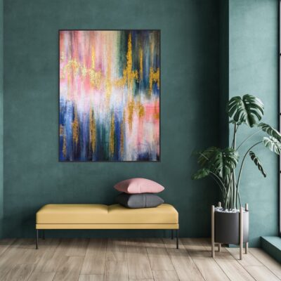 I then combine these elements together to make paintings, daring to juxtapose different things together and see what happens, and keeping my love of exploring alive by being playful and experimenting with different materials and processes. I build each painting in layers to create depth. My initial layers begin intuitively, using a variety of different mixed media and expressive mark-making. I then develop the painting with acrylic, seeing an image emerge from the initial layers. I finish in oil paint, using glaze to add further depth and bring out the vibrant colour I love so much.