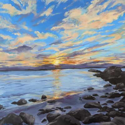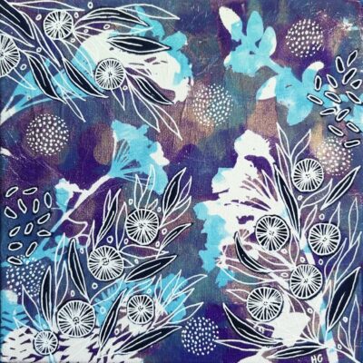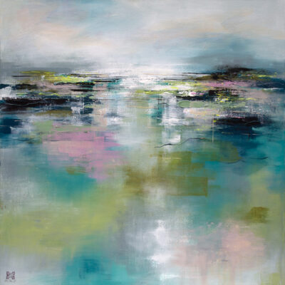 My paintings are inspired by being outdoors and active. I love to walk through the landscape which continually offers new and unexpected moments of inspiration. I am always exploring and can be captivated for ages by what I find – whether it’s stunning colour combination, a vast open space, intricate close up details or something beyond what I see with my physical eyes. I capture these experiences by taking photos, making sketches, even sound recordings. I take these elements, along with my memory and experience of the place back to the studio.